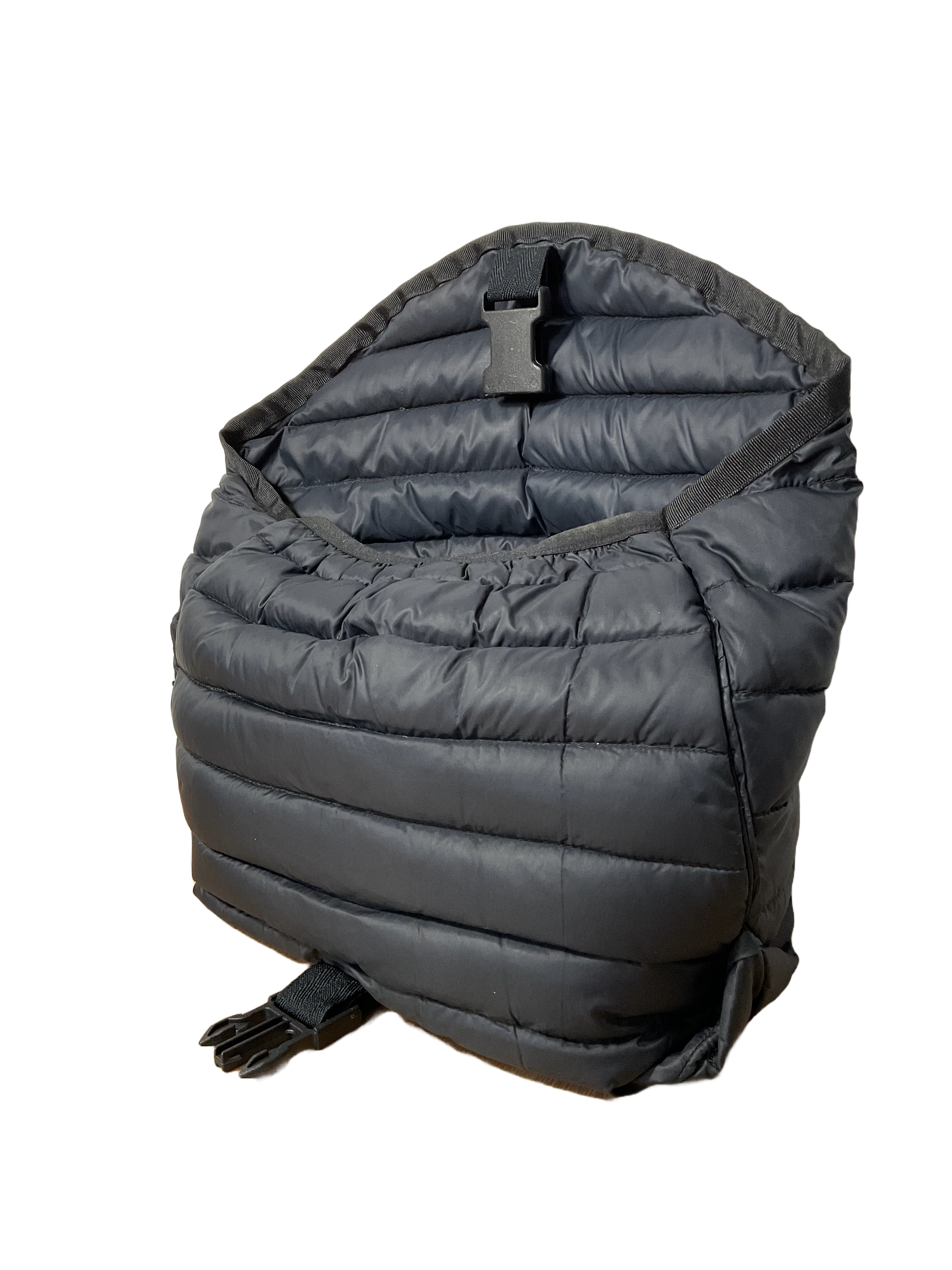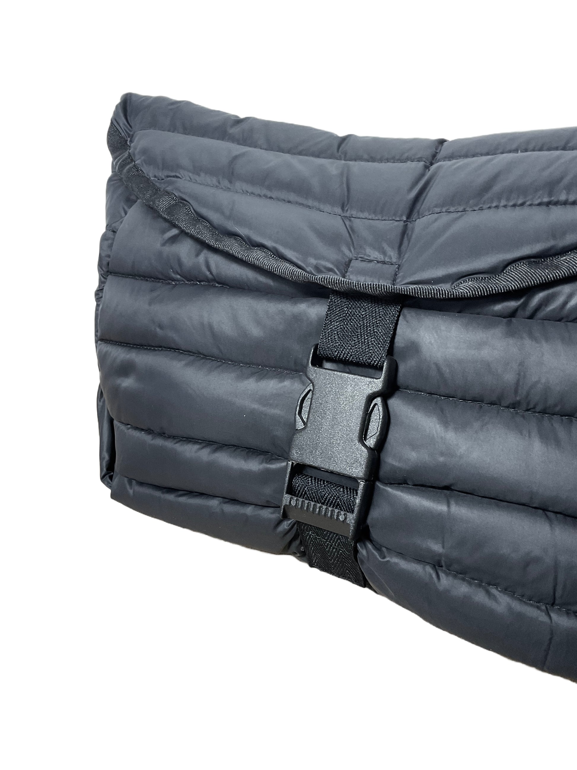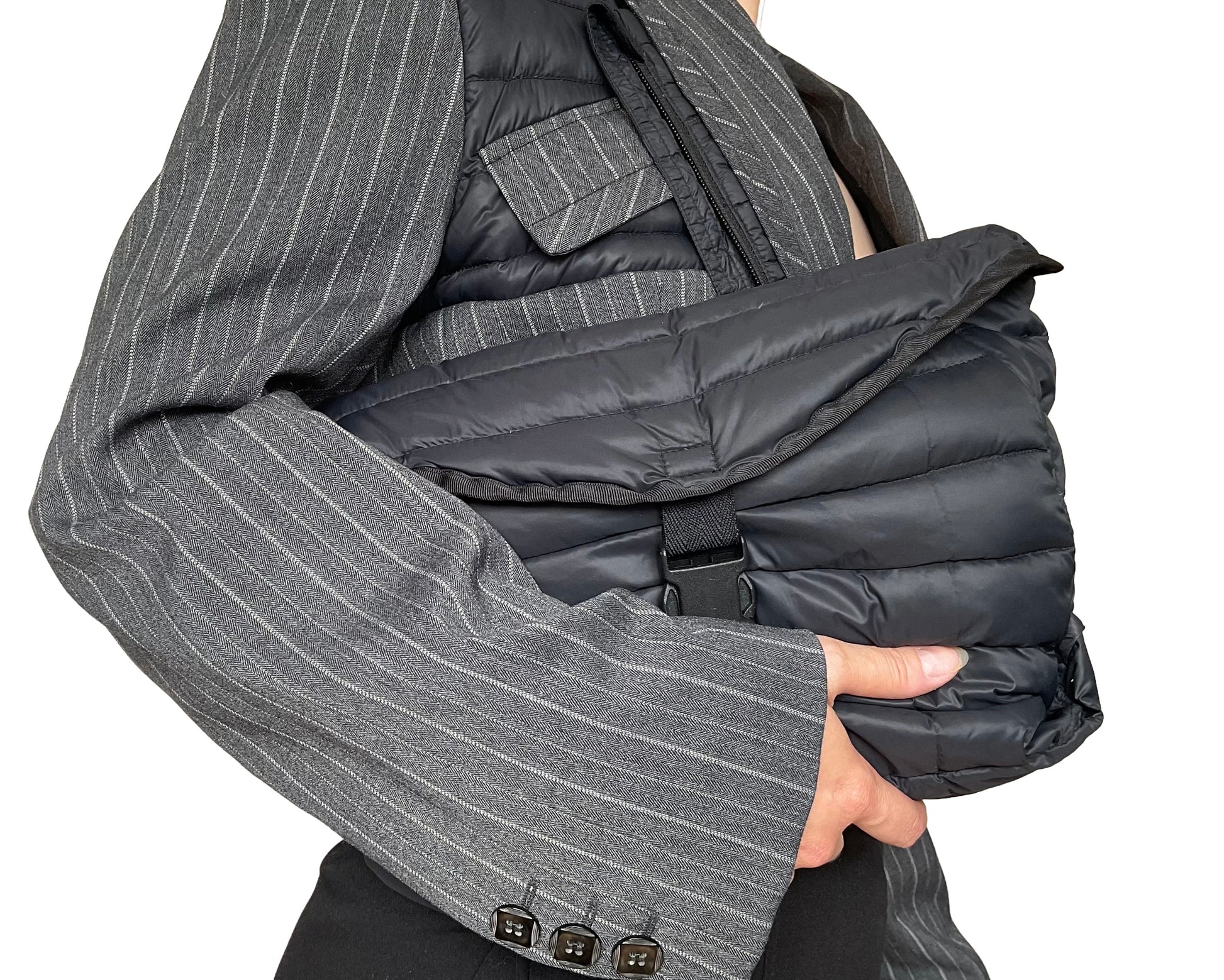This piece began life as a padded feather and down jacket. The upper sleeve has been reworked by hand into a one-of-a-kind lightweight clutch bag with original shoulder pattern curve creating the front flap.